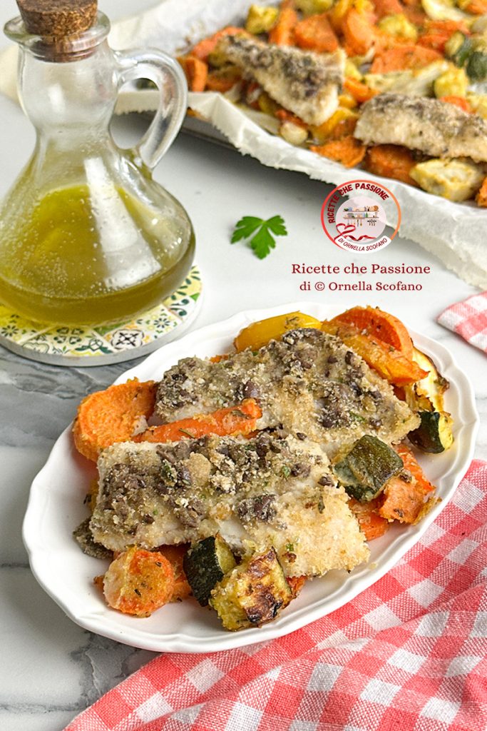 Bacalao gratinado con aceitunas y verduras al horno. Un plato único delicioso y fácil de preparar. Hace unas noches preparé una hermosa bandeja de verduras gratinadas al horno para una cena con amigos, gustaron tanto que decidí repetirlas para compartir la receta con vosotros, y dado que quería preparar también una deliciosa cenita, pensé en añadir a la bandeja de verduras unos filetes de bacalao, así tendría listo un buen plato único ligero y sabroso bien equilibrado con verduras, proteínas y carbohidratos aportados por el boniato, adecuado para quienes están a dieta, o para quienes tienen diabetes, ya que libera lentamente el índice glucémico. Se puede usar pan rallado sin gluten para hacer la receta apta también para celiacos. Para hacer los filetes de bacalao más sabrosos, pensé en usar aceitunas, tipo taggiasca, yo tenía las leccino que sinceramente prefiero y nunca me faltan, y así nació este plato. También podéis combinar los filetes con otros acompañamientos, pero os recomiendo probarlos así gratinados con aceitunas, son realmente fáciles y deliciosos.
