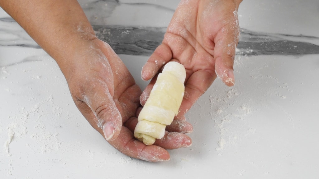 Siempre trabajando sobre una superficie enharinada y con las manos enharinadas trabajamos cada bollo para formar un bollito. Extendemos cada bolita de masa y luego usando el rodillo y harina, obtenemos una tira delgada y enrollamos para formar un bollito enrollado.