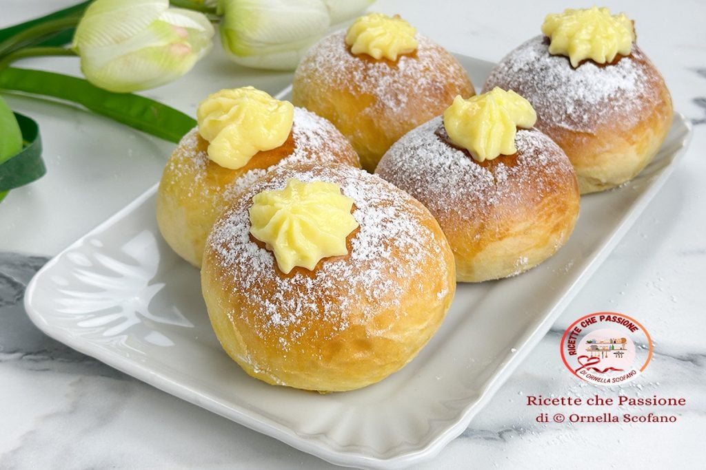 Pincelamos con huevo, después de dejarlas fermentar, antes de la cocción, y horneamos en horno caliente a 180°C por aproximadamente 15 minutos. Sacamos del horno y dejamos enfriar y mientras tanto cocemos las últimas brioches, por lo tanto, una bandeja a la vez.