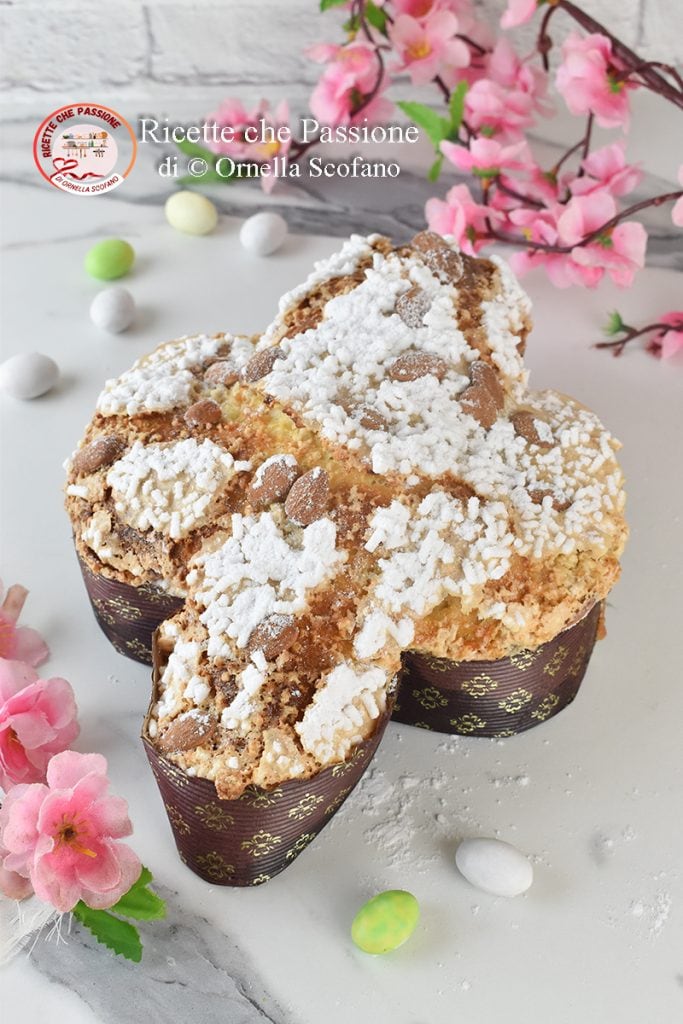 La colomba de Pascua es un dulce fermentado símbolo por excelencia de la Pascua en Italia, con una cobertura de glaseado de almendras, similar al panettone y al pandoro en Navidad. La Colomba de Pascua simboliza la paz y la reconciliación, regalar la colomba en Pascua significa de hecho dar una señal de paz y amor a quien la recibe, un claro recordatorio del relato del diluvio universal. Terminada la lluvia, de hecho, esperados 7 días, Noé hizo salir a una paloma que regresó por la noche trayendo una rama de olivo, señal del perdón de Dios hacia los hombres y desde entonces se convirtió en símbolo de paz. Un símbolo de paz tan bueno y suave que en Pascua se hacen grandes banquetes, pero ¿quieres poner el placer de hacerla en casa, con tus propias manos y creándola con los sabores que más amamos? Sí, porque se puede personalizar, por ejemplo, si no te gusta la uva pasa se puede omitir, como hice yo, o se pueden excluir los cítricos, o se pueden añadir gotas de chocolate, o se puede rellenar con deliciosas cremas. Hoy para ti la colomba clásica, un fermentado muy aromático, con naranja en la masa y almendras para la cobertura. Para la receta he usado pasta madre deshidratada con levadura, una excelente solución para quienes no tienen levadura madre fresca disponible, se encuentra de hecho en todos los supermercados. Veamos cómo realizar la receta, y por favor, no tengas prisa, las esperas son muy importantes así como el trabajo. Lee aquí mi reseña al horno indesit que he usado para la cocción.