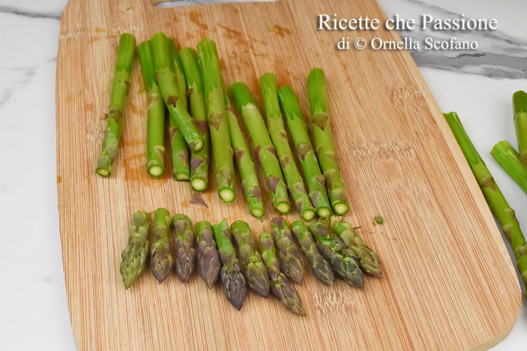 Limpiamos los espárragos, los quebramos con las manos para tomar solo las partes tiernas, comenzamos desde las puntas, a romperlos, descendiendo, hasta que estén suaves, deben romperse fácilmente. Los lavamos y los ponemos a cocinar en una sartén con un poco de aceite y sal, cubrimos y cocinamos así unos 10 minutos, para acelerar la cocción agregamos un chorrito de agua. Dejamos secar completamente.