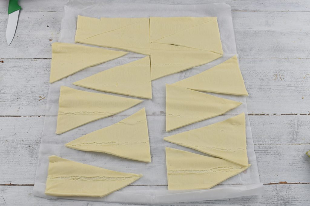Desenrollamos un rollo de hojaldre rectangular, que hemos dejado un par de minutos fuera de la nevera. Lo cortamos por la mitad a lo largo. Luego dividimos en triángulos, como en la foto. Si es redondo, lo dividimos en 8 porciones o más si quieres cruasanes más pequeños.