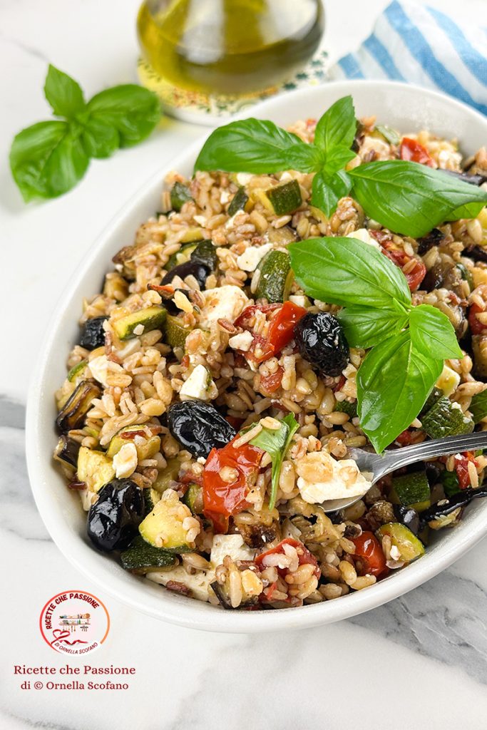 Un plato fresco, rico y delicioso, la ensalada de 5 cereales con feta y verduras al horno, se prepara en pocos minutos y es el plato del verano, ligero y saludable para disfrutar en los días más cálidos, incluso en la playa. Con este plato he conquistado incluso a mi marido que no es muy fan de los cereales mixtos, pero que combinados con la feta y las verduras asadas al horno y por lo tanto más sabrosas, lo ha encontrado realmente excelente, y cuando él dice excelente, yo me siento más tranquila, porque es obvio que cocino a mi gusto, pero satisfacer también los gustos más difíciles me hace estar tranquila. Si también quieres disfrutar de una fresca ensalada con 5 cereales, trigo, arroz, cebada, avena y espelta, entonces solo queda comprar un paquete de cereales, ya listos para cocinar y en 20 minutos nuestro plato estará listo. Veamos cómo.