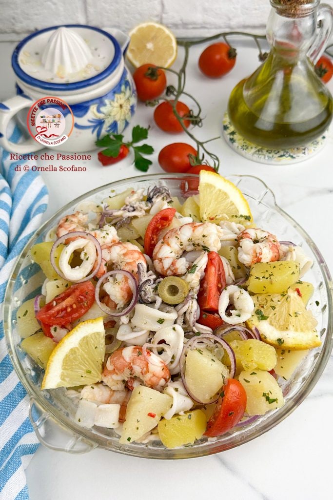 Una fresca y deliciosa ensalada de gambas y calamares con patatas aderezada con salsa salmoriglio, fácil y rápida de preparar es el plato perfecto para disfrutar en los días más calurosos o en ocasiones especiales, perfecta para enriquecer cualquier tipo de menú, especialmente de pescado. Para la preparación de la ensalada de gambas y calamares con patatas podemos usar tanto pescado fresco como congelado, lo importante es que sea de excelente calidad. Para la elección de los calamares os recomiendo calamares pequeños y por lo tanto tiernísimos y rápidos de cocer, y sobre todo es fundamental que queden blandos. Atención a limpiar bien tanto los calamares como especialmente las gambas, en mi caso langostinos, debemos quitar ese hilito negro que está en el dorso que constituye el aparato digestivo del crustáceo, podemos extraerlo delicadamente cuando tiramos de la cabeza, o ayudándonos con un palillo. Entonces veamos cómo preparar esta deliciosa receta, ideal para preparar con antelación para disfrutarla fresca y llena de aromas después de un poco de reposo que permite amalgamar los sabores y exaltarlos.