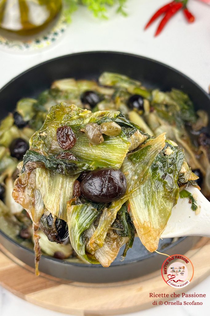 Escarola a la napolitana en sartén, un acompañamiento delicioso y fácil de preparar, sin necesidad de hervir previamente la escarola, que con una cocción rápida queda crujiente y conserva sus propiedades. Para preparar la escarola a la napolitana necesitamos un poco de filetes de anchoas, pasas, aceitunas, alcaparras o piñones, ajo y guindilla. Prepararla es muy sencillo, se hace un sofrito a fuego lento para derretir las anchoas en el aceite caliente con los otros ingredientes y luego se añade la escarola lavada y cortada, en crudo, bastará añadir la escarola húmeda después del lavado, o añadir un poco de agua para llevarla a cocción, con tapa, en pocos minutos. Entonces veamos cómo prepararla.