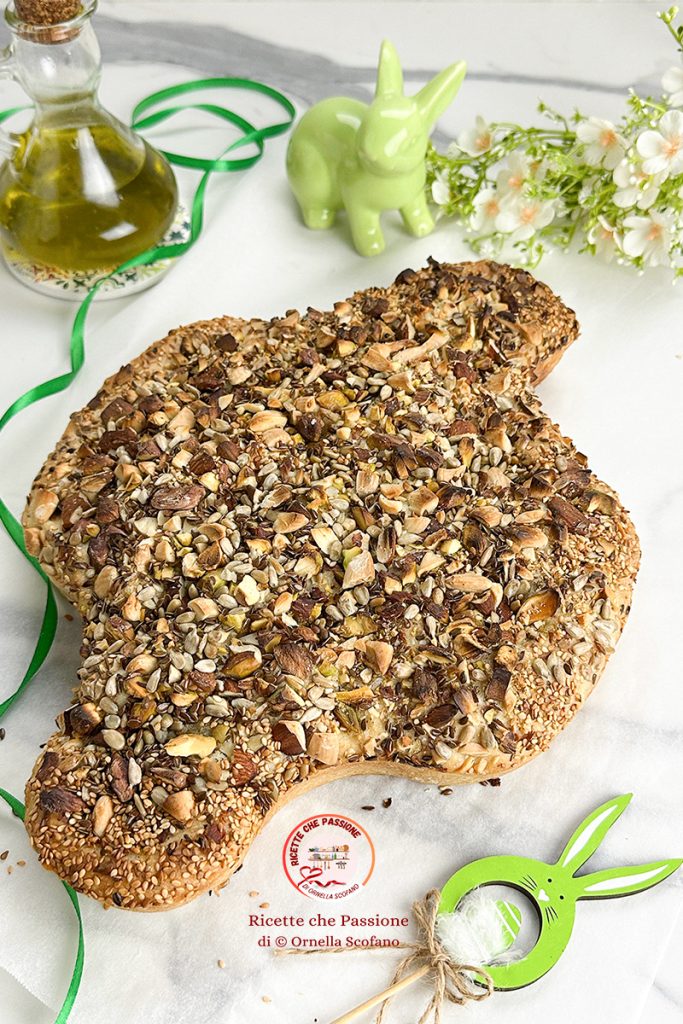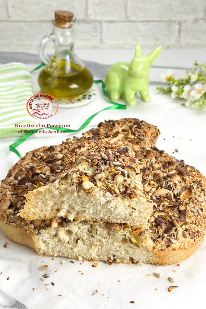 Focaccia colomba de Pascua con semillas, una delicia increíble y es facilísima de preparar, se amasa con una cuchara, se deja levar primero un par de horas, luego una horita en el molde y al final se condimenta como una focaccia normal, y además se espolvorea con muchas semillas, he usado almendras y pistachos, he añadido semillas de sésamo, de lino y de girasol, y qué decir, realmente increíble, tenía el sabor clásico de la focaccia, luego la preparé un poco más alta para llenar el molde, y ha salido suavísima, a pesar de solo 5 g de levadura para 500 g de harina mixta 0 y 00 y un levado de solo 3 horas en caliente, en microondas con un bol de agua caliente debajo del bol de la masa, y el mismo bol de agua caliente debajo del molde para el segundo levado, así que en un abrir y cerrar de ojos la focaccia está lista.