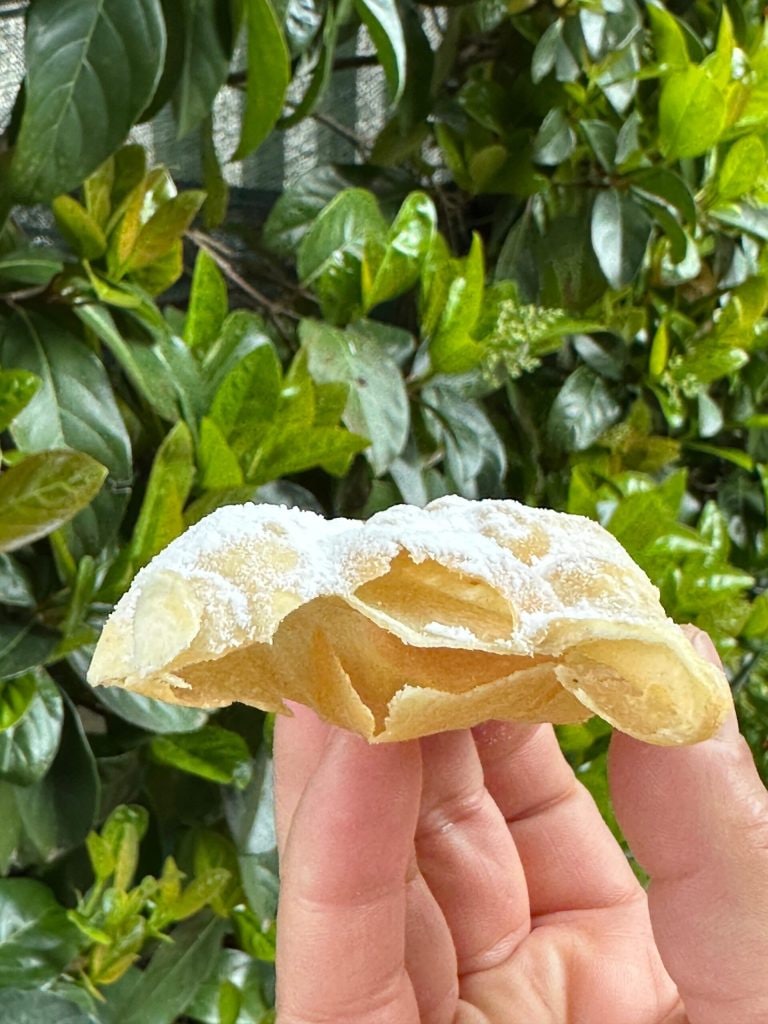 Al final, quitamos el papel mojado de aceite, espolvoreamos con azúcar glas y nuestras deliciosas frappe están listas para disfrutar, crujientes y con burbujas con un buen aroma de anís, son una verdadera tentación, una lleva a otra, y son bien frágiles y se deshacen en la boca.