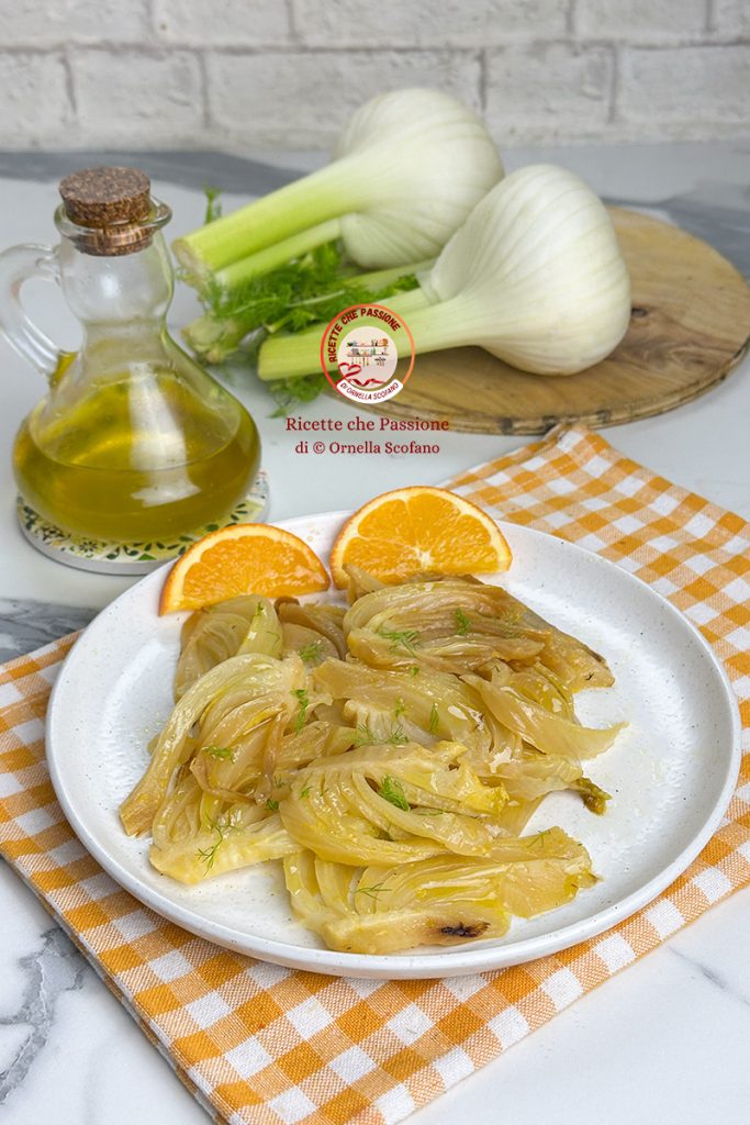 Los hinojos a la naranja son una guarnición sabrosa, excelente para preparar con buenas naranjas de zumo, se puede disfrutar solo, o acompañado de una porción de carne, delicioso con carne de cerdo, o también con pescado, quizás aromatizados también con zumo de naranja recién exprimida.