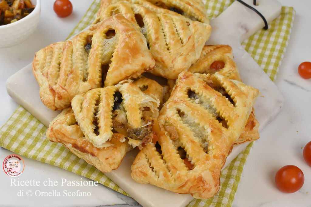 Hojaldritos de hojaldre con verduras, excelente entrante delicioso, para preparar con antelación, óptimos para servir tanto ligeramente tibios como fríos. Perfectos para nuestros bufés, o para las excursiones, siempre es agradable tener un tentempié para picar dondequiera que nos encontremos y ahora llega el puente del 25 de abril, seguramente nos será de gran ayuda, y se pueden rellenar también con diferentes rellenos, a mí me encantan con las verduras. Son muy fáciles de preparar, es prácticamente una receta para vaciar la nevera, se cocinan un poco las verduras y se rellenan los hojaldritos de hojaldre, pero quizá es mejor que te muestre cómo, así puedes realizarlos también tú como lo hice yo, más vistosos con estas aberturas que dejan entrever el relleno dentro. Así si los preparamos con sabores variados podemos también ver qué hay dentro.