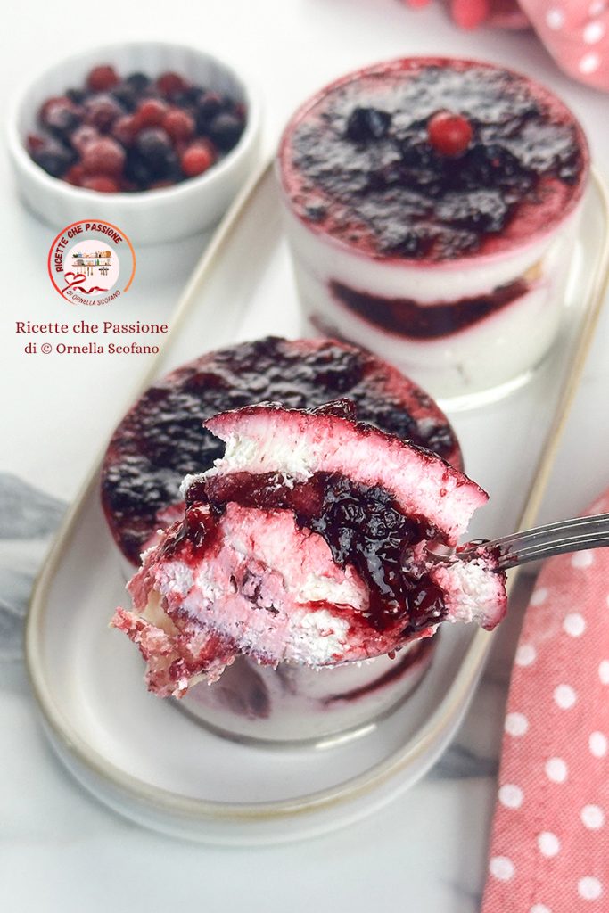 Un verdadero placer sumergir la cucharilla en este delicioso postre cremoso de frutas del bosque con crema de mascarpone o yogur griego rápido con nata montada sin huevos.