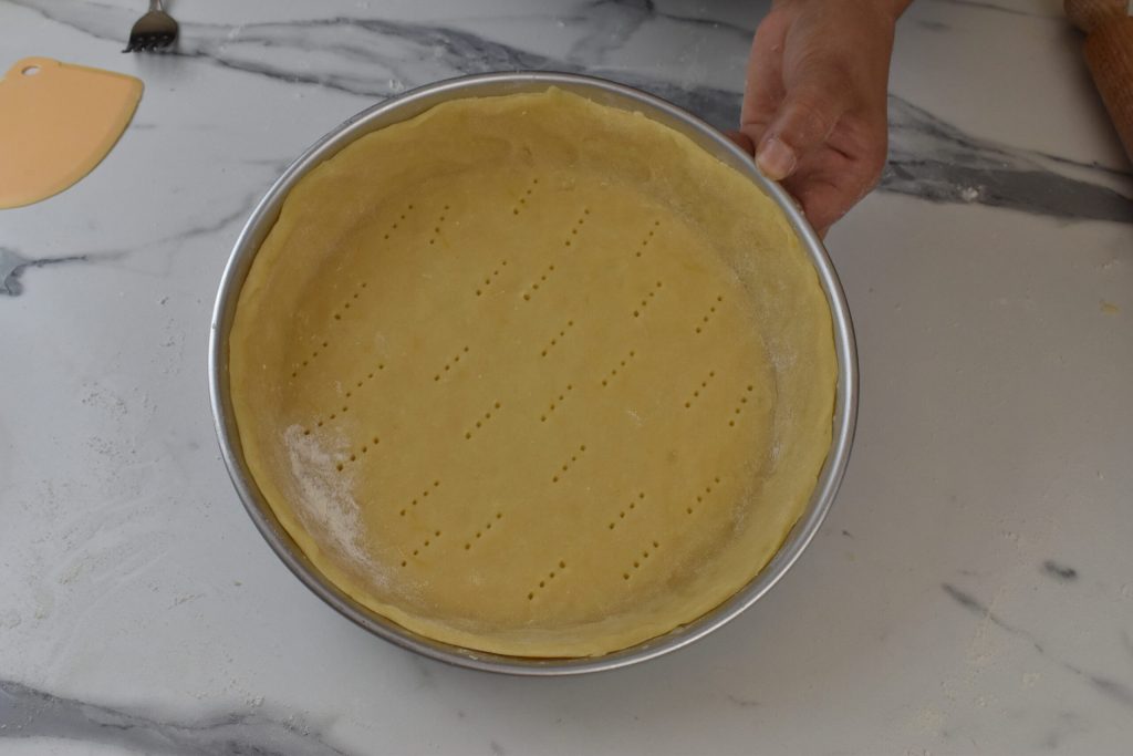 Retomamos la masa quebrada, la trabajamos rápidamente, para hacerla más elástica así no se rompe. Extendemos con rodillo sobre una superficie bien enharinada, unos 5 mm de grosor.