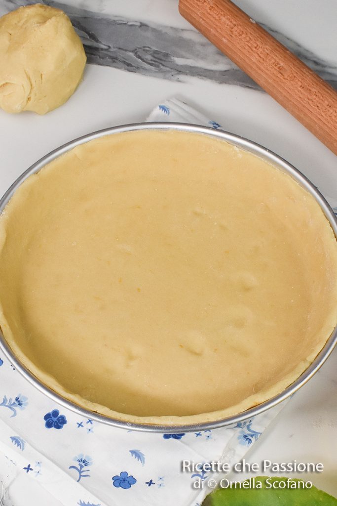 Forramos un molde para pastiera de 24 cm de diámetro, sin engrasar y enharinar el molde, pero espolvoreando harina sobre la base de la masa quebrada que va en el molde. Quitamos el exceso y lo compactamos para formar un bollo.