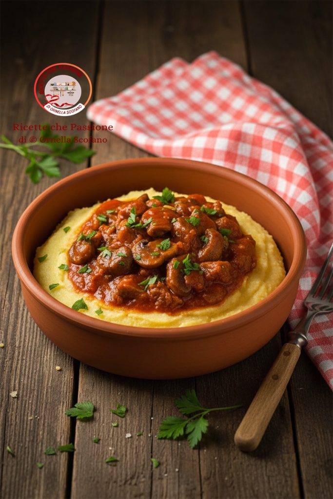 Para una preparación rápida he usado una harina para polenta precocida, alternativamente se puede usar harina sin precocinar, para una cocción más lenta, y también el ragú se puede hacer a cocción lenta en la olla. Como lo he hecho yo es rápido y adecuado para quienes tienen prisa pero quieren comer un plato sustancioso.
