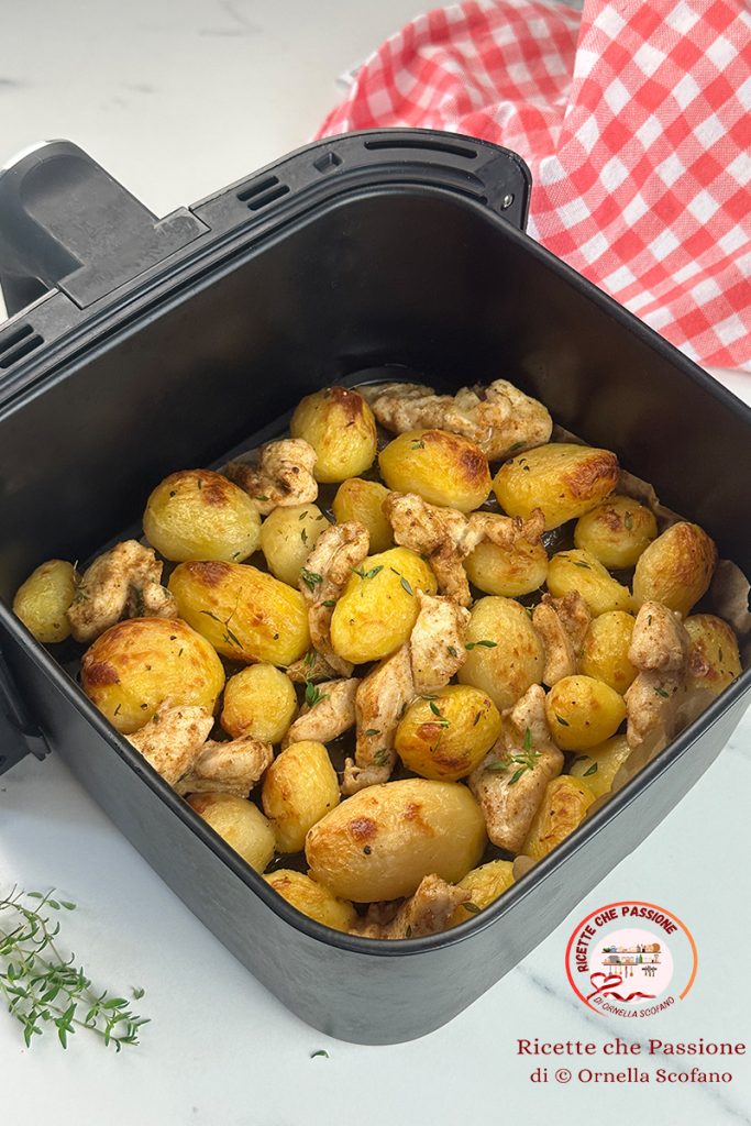 Pollo con patatas en freidora de aire, receta rápida y deliciosa en ligereza. Tiritas de pechuga de pollo con patatas nuevas, plato rico y sabroso que pones a cocinar en 2 minutos en freidora de aire, y lo llevas a la mesa en menos de 25 minutos. El pollo con patatas es un perfecto plato único acompañado con una rica ensalada mixta, yo lo acompañé con la ensalada de col roja, ¡qué delicia! Últimamente estoy usando mucho la freidora de aire, finalmente la saqué del armario y desde que la tengo a mano es muy práctico usarla para preparar platos rápidos y sabrosos, ligeros en pocos minutos, y una vez que la freidora comienza solo tengo que esperar el final de la cocción. Entonces veamos cómo he preparado estos deliciosos bocados de pollo especiados con patatas nuevas sabrosas al tomillo en freidora de aire o como alternativa al horno, añadiendo el pollo solo cuando las patatas ya están doradas.