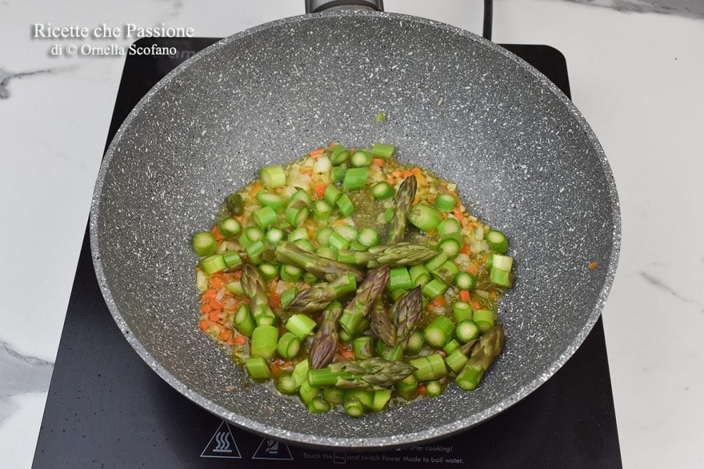 Luego añadimos a la sartén también el arroz, cuando el caldo esté completamente seco, y dejamos tostar, desglasamos luego con el vino blanco, dejamos secar bien y poco a poco añadimos el caldo que sirve para llevar a cocción nuestro risotto de espárragos.