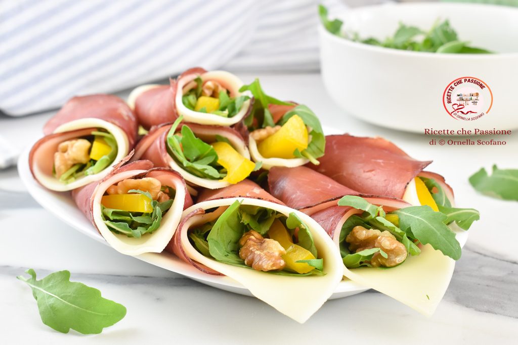 Rollitos de bresaola y queso con rúcula, una idea fresca, fácil y rápida sin cocción para un aperitivo vistoso que se puede preparar en pocos minutos con sencillez, con bresaola de punta de cadera, lonchas de queso edam y rúcula fresca con un poco de pimiento que, además de sabor, aporta color y también nueces. Un aperitivo fresco y rápido sin estaciones, adecuado para los calurosos días de verano pero también para nuestros aperitivos festivos, delicioso y fácil de preparar. La bresaola es un embutido adecuado para preparar aperitivos rápidos y deliciosos, fáciles de preparar pero siempre refinados y elegantes, y esta vez también lograremos sorprender a nuestros invitados.