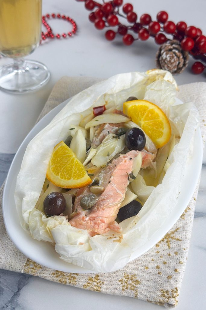 Cómo preparar el salmón en papillote a la naranja, con hinojos, al horno, o en freidora de aire, bastarán 10 minutos, para llevar a la mesa un delicioso filete de salmón fresco, de sabor refinado y exquisito. Un plato realmente fácil y con una cocción rapidísima, ideal para llevar a la mesa también en las fiestas, con su sabor delicioso conquistará todos los paladares. Un plato que se prepara realmente en 5 minutos, sin ningún esfuerzo, bastará preparar el papillote, colocar dentro los filetes de salmón, uno entero, o pequeñas porciones si se desean hacer muchos papillotes, uno para cada comensal, y luego añadir el condimento, un simple hinojo cortado en finas rodajas y marinado con naranja, naranja que otorgará al salmón un sabor increíble. Veamos cómo prepararlo.