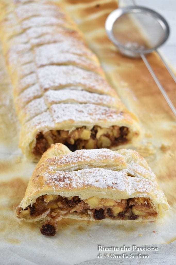 Strudel de manzana con hojaldre listo, una receta rápida para un buen postre de manzana que debo admitir últimamente preparo muy a menudo, perfecto como postre para servir al finalizar el almuerzo del domingo. A menudo el domingo es almuerzo en familia, todos pensamos en un menú rico entre aperitivos, primeros, segundos y guarniciones y nadie piensa en el postre, así ocurrió hace un par de domingos que a último minuto mi cuñada me dice y el postre ¿quién lo piensa?, por suerte tenía en la nevera un rollo de hojaldre, y pensé en hacer un postre, en pocos minutos, ya que el tiempo disponible era realmente poco. Las manzanas en mi casa nunca faltan, 2 nueces, un poco de pasas que siempre guardo de reserva en un frasco de vidrio, y así nació mi strudel de manzana con hojaldre, enriquecido con muchas nueces y pasas, perfumado al ron. Cuando me ocurre tener en la nevera un rollo de hojaldre lo preparo a menudo para el almuerzo del domingo, es una buena manera de cerrar el almuerzo del domingo en familia, disfrutando de un buen café, al calor de la chimenea.