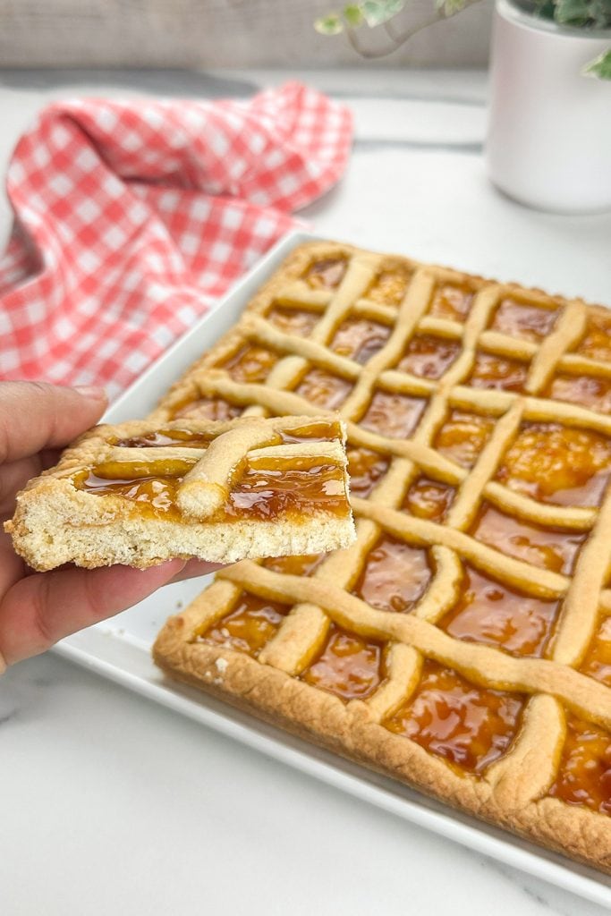 Tarta casera de masa quebrada suave con mantequilla, o alternativamente con aceite de oliva, un buen dulce perfecto para el desayuno o la merienda, relleno con mucha mermelada, de albaricoque para mí, o la que prefieras. Estamos en las fiestas, y sé que el panettone y el pandoro son los más populares, pero a mí no me gustan mucho, así que para las fiestas he horneado dos bonitas tartas, perfectas para disfrutar en el desayuno, pero también son excelentes para una merienda, o para llevar a la mesa al final de la comida. Me encanta, y cualquier momento es bueno. Para la masa quebrada suave, la receta es muy sencilla, es una masa quebrada normal pero con la adición de levadura, así que en la cocción crece un poco y queda más alta y suave. Entonces veamos cómo prepararla.