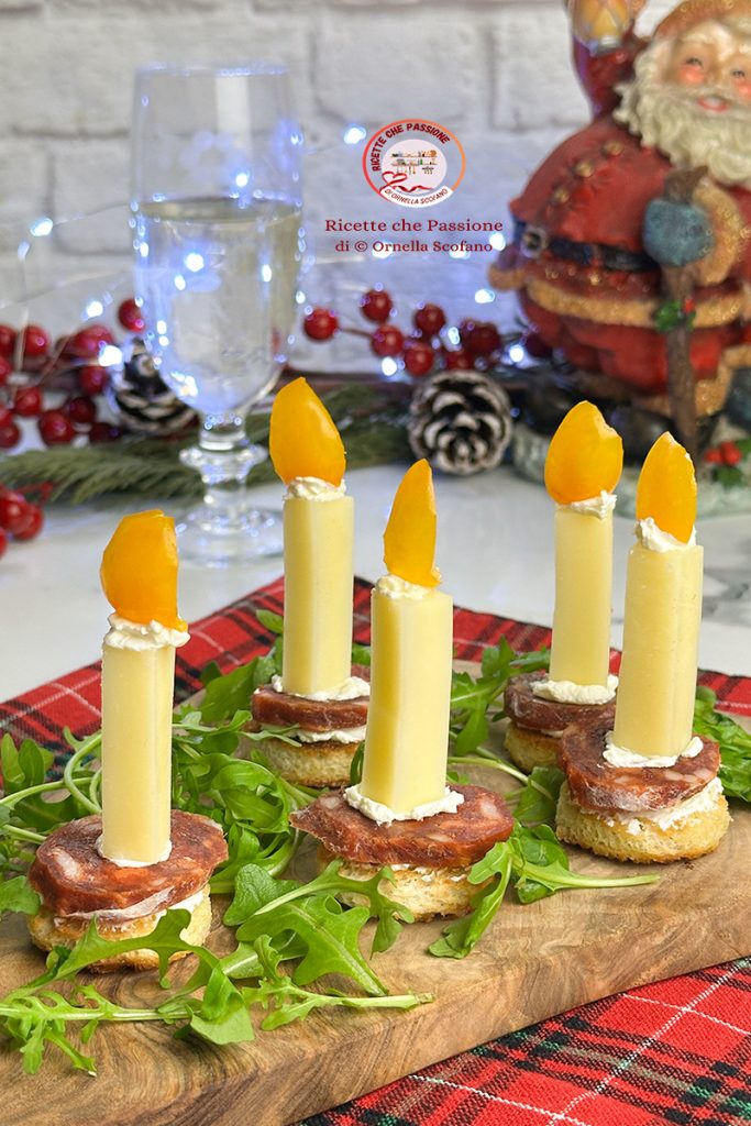 Velitas aperitivo de Navidad con queso y salami, una idea rápida y simpática para llevar a la mesa durante las fiestas. Las preparé sin palillos porque a menudo nuestros invitados distraídos terminan olvidándoselos. Utilicé queso en bastón para hacer las velas, en la base crostini de pan crujiente y queso de untar con una rodaja de buen salami calabrés, y para hacer la llama un simple tomate cherry o también queda bien una cebollita en vinagre. Se pueden hacer en pocos minutos y se llevan directamente a la mesa. Vamos a ver cómo prepararlas, te dejo otras ideas para los aperitivos de Navidad, también vegetarianos y rápidos.