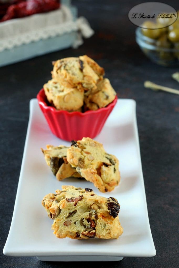 Los cantucci salados con aceitunas son unos perfectos finger food para servir en la mesa como entrante o para un aperitivo. La realización de estos cantucci es igual a la de la versión dulce, pero en este caso he utilizado ingredientes salados, como: sal y pimienta, parmesano, orégano, aceitunas verdes, tomates secos y piñones tostados. Estos cantucci salados son crujientes y ricos en sabor, ¡ideales para cualquier ocasión y serán apreciados por todos!