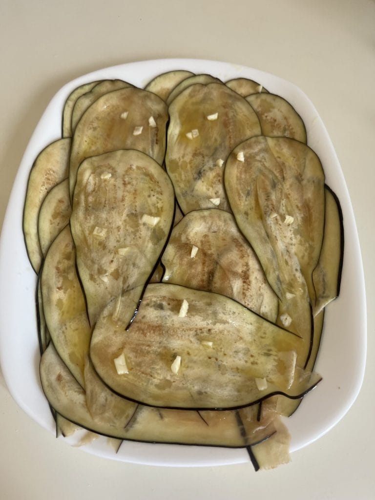 • Después, con una mandolina o un corta verduras, cortamos las berenjenas en rodajas muy finas, como en la foto, deben ser casi transparentes. Les ponemos sal una por una, para que pierdan el exceso de agua, y las extendemos sobre una rejilla o las colocamos en un escurridor y las dejamos reposar durante media hora.