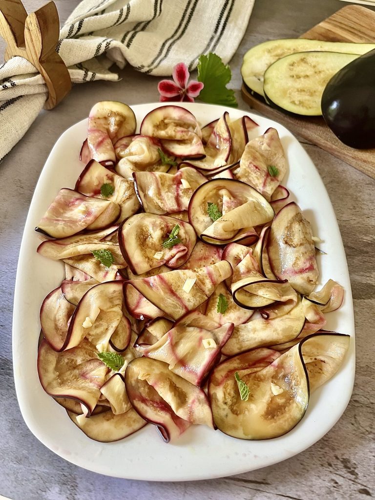 El carpaccio de berenjenas es un acompañamiento fresco y muy sabroso, preparado con una simple marinada de vinagre, ajo, aceite y sal, todo ello enriquecido con unas hojas de menta. Las berenjenas no se pueden consumir crudas por la presencia de solanina, una sustancia tóxica. Por ello se procede con una marinada lenta a base de vinagre y también es fundamental dejarlas purgar del agua de vegetación con la sal.