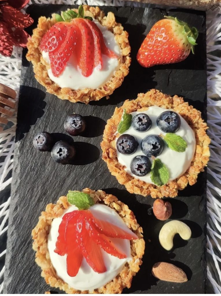 Añadimos el sirope de agave al yogur, mezclamos bien y rellenamos las cestas. Decoramos con la fruta a nuestro gusto.