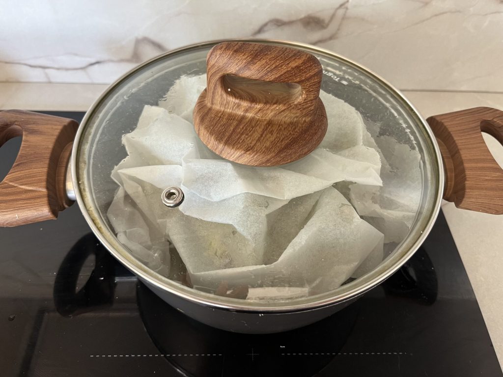 • Cubre con papel de horno. El papel retiene el vapor, mantiene la humedad e impide que la parte superior se reseque o se oscurezca demasiado. Además mantiene las alcachofas firmes y en pie. Tapa y cocina a fuego lento durante 25-30 minutos o hasta que estén bien tiernas pero no deshechas. El tiempo de cocción puede variar ligeramente según el tamaño de las alcachofas.