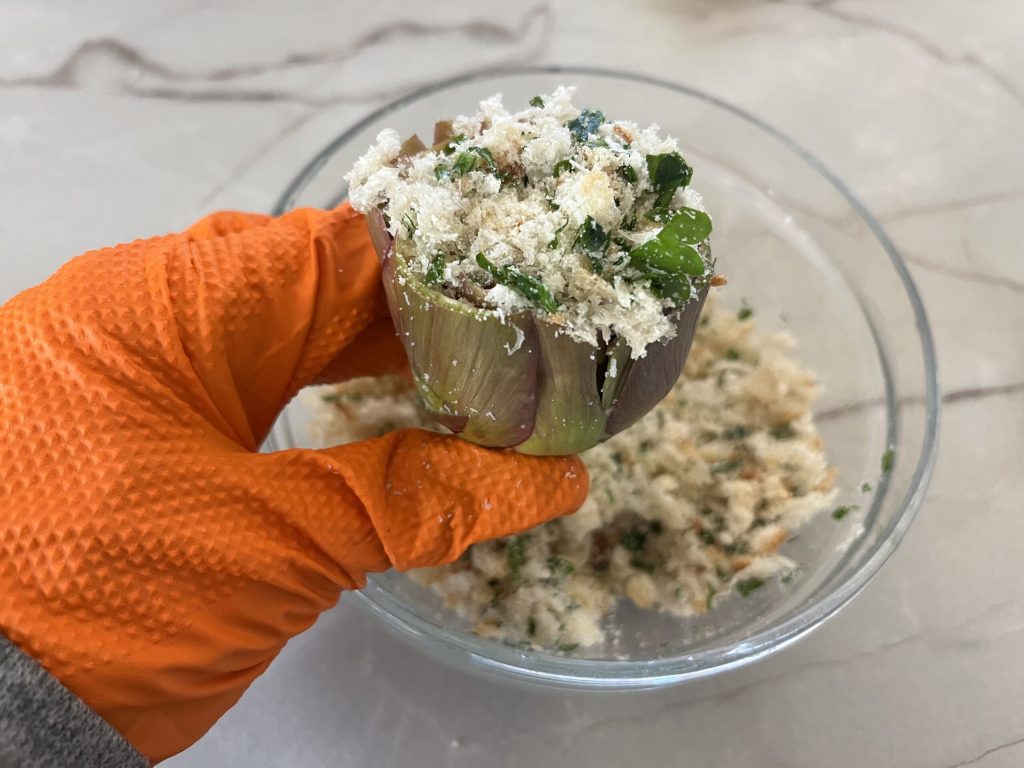 • Escurre las alcachofas y ábrelas bien por el centro. Rellénalas abundantemente presionando y compactando con las manos para que, durante la cocción, el relleno no se salga.