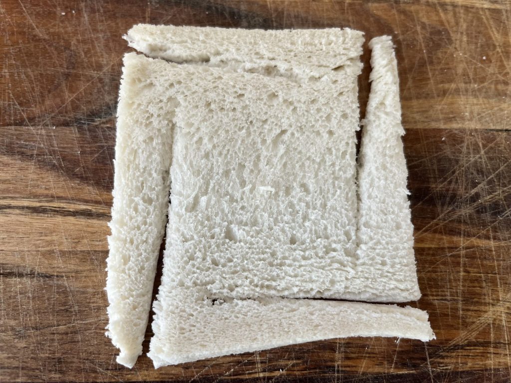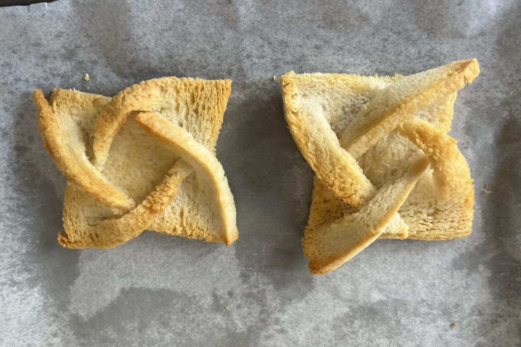 Dobla las puntas hacia el centro del pan de molde. La última punta se inserta en la primera.