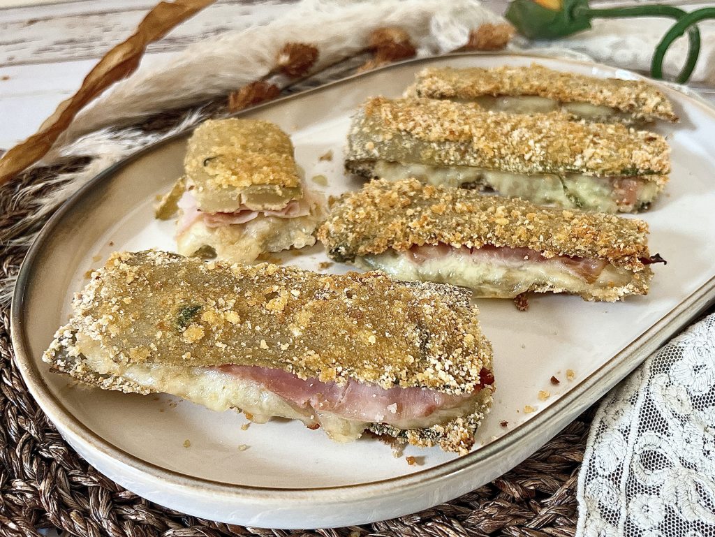 Primero se hierven y luego se empanan en huevo y pan rallado, y posteriormente se rellenan con jamón y queso.