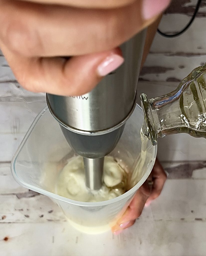 Incorpora el aceite de girasol en hilo mientras la batidora de mano está en acción.