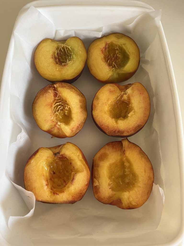 Mientras tanto, corta los melocotones por la mitad y retira, con la ayuda de una cuchara, el hueso.
