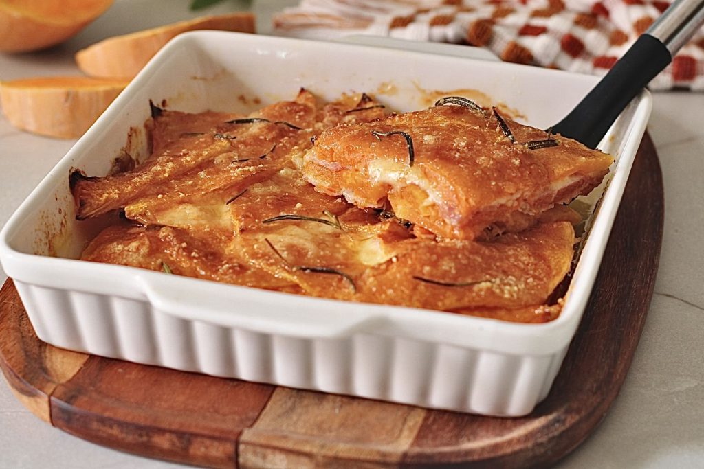 Los primeros 15 minutos cubre con un pequeño papel de aluminio (así la calabaza se cocina sin quemarse arriba), en los últimos 5 minutos quita el aluminio y deja gratinar para obtener la costra dorada.