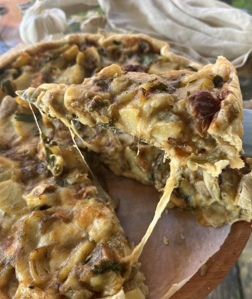 El pastel de patatas y setas se puede definir como un plato sabroso, cremoso, delicioso, rico y diría que completo. La combinación de estos dos ingredientes con la scamorza lo hace muy apetitoso. Preparado con verduras de temporada, sacado del horno bien caliente, nos calienta tanto el paladar como el cuerpo de placer.