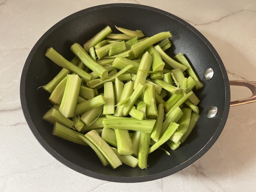Con un pelador pela la parte externa del tallo, dejando expuesta la parte interna más tierna.