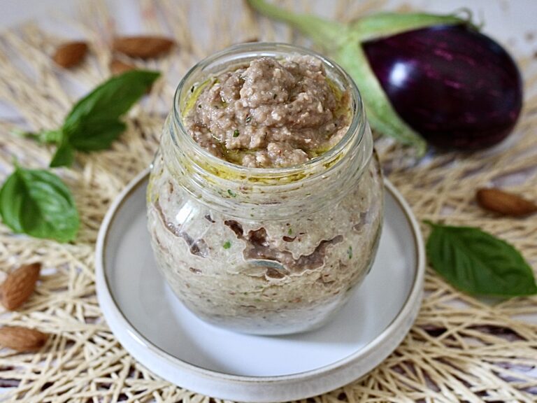 Puede usarse en una amplia gama de platos. Además de la pasta, el pesto de berenjenas es excelente para untar en crostini, como salsa para acompañar verduras a la parrilla o carnes blancas, o como relleno para pasteles salados y bocadillos gourmet.