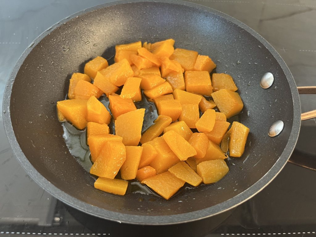 Una vez dorado, retíralo y añade los cubos de calabaza. Sala y cocina durante 8-10 minutos (el tiempo varía según el tamaño de los cubos de calabaza) con tapa y voltea de lado varias veces.