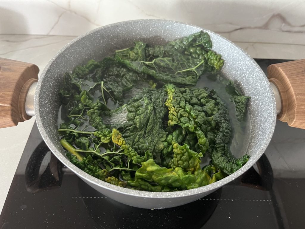 • Lleva a ebullición una olla con abundante agua salada. Sumerge la col rizada negra y cocina durante 2-3 minutos.