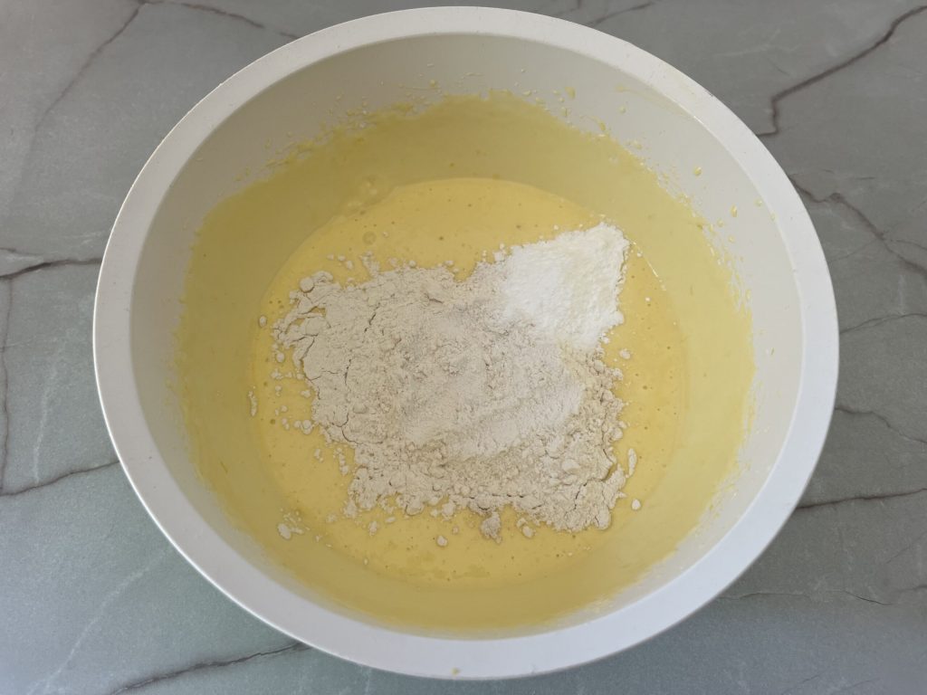 Con una batidora de varillas monta durante unos minutos hasta obtener una mezcla clara y espumosa, paso fundamental para garantizar la esponjosidad del bizcocho. Siempre montando, añade el yogur natural o el kéfir, el aceite de oliva virgen extra en hilo, de forma que la masa quede más ligera y digestiva que usando mantequilla, y luego la ralladura de limón y la vaina de vainilla o la esencia.