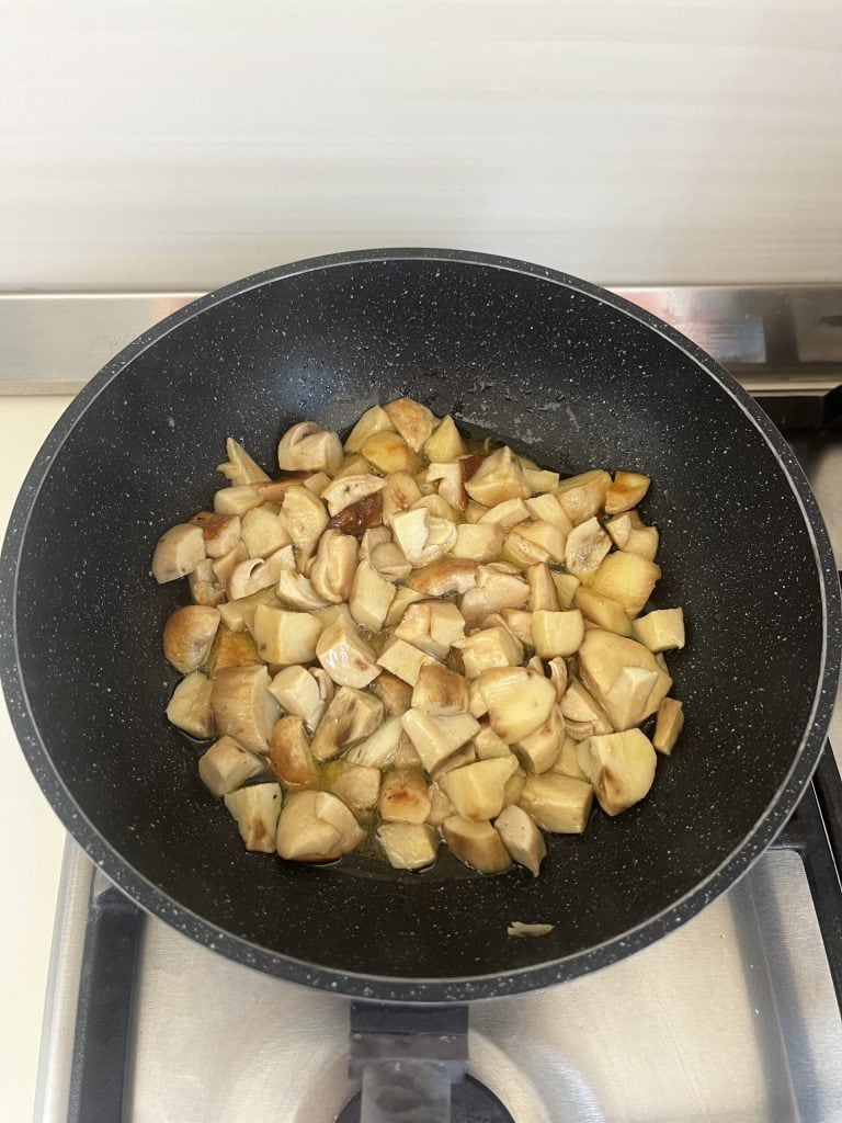 • Mientras tanto, en una cacerola, añadimos el aceite de oliva virgen extra, lo llevamos a temperatura y añadimos los dientes de ajo y los dejamos dorar. Una vez dorados, los retiramos y añadimos las setas cortadas en trozos. Luego cocinamos durante unos veinte minutos, los dos primeros minutos a fuego alto, luego a fuego bajo y con tapa, sazonamos y revolvemos de vez en cuando con una cuchara de madera hasta que se cocinen.