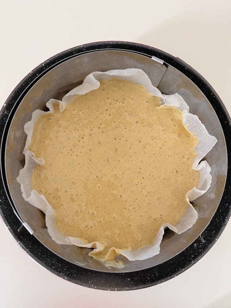 • a velocidad 1 o mezcla con una espátula delicadamente para no desmontar la mezcla. Vierte en un molde para tarta d. 24 forrado con papel de horno y hornea a 180 grados durante unos 30 minutos hasta que esté ligeramente dorada