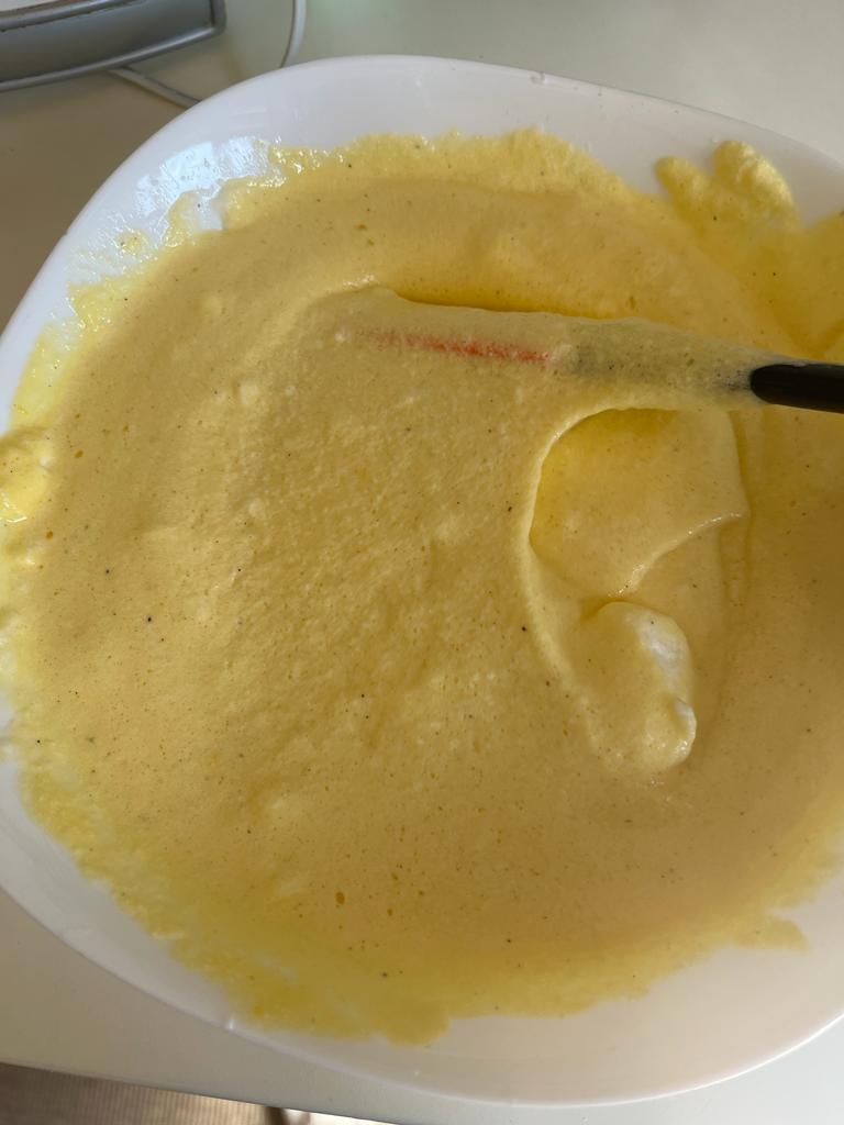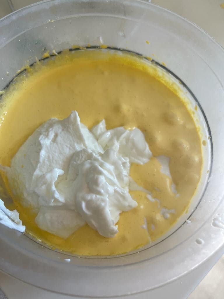 Luego agregamos a las yemas el yogur griego y siempre con la batidora mezclamos bien. A continuación, incorporamos la vainilla, luego la levadura, luego el almidón de maíz y por último la ralladura de limón. Con la batidora eléctrica mezclamos todo.