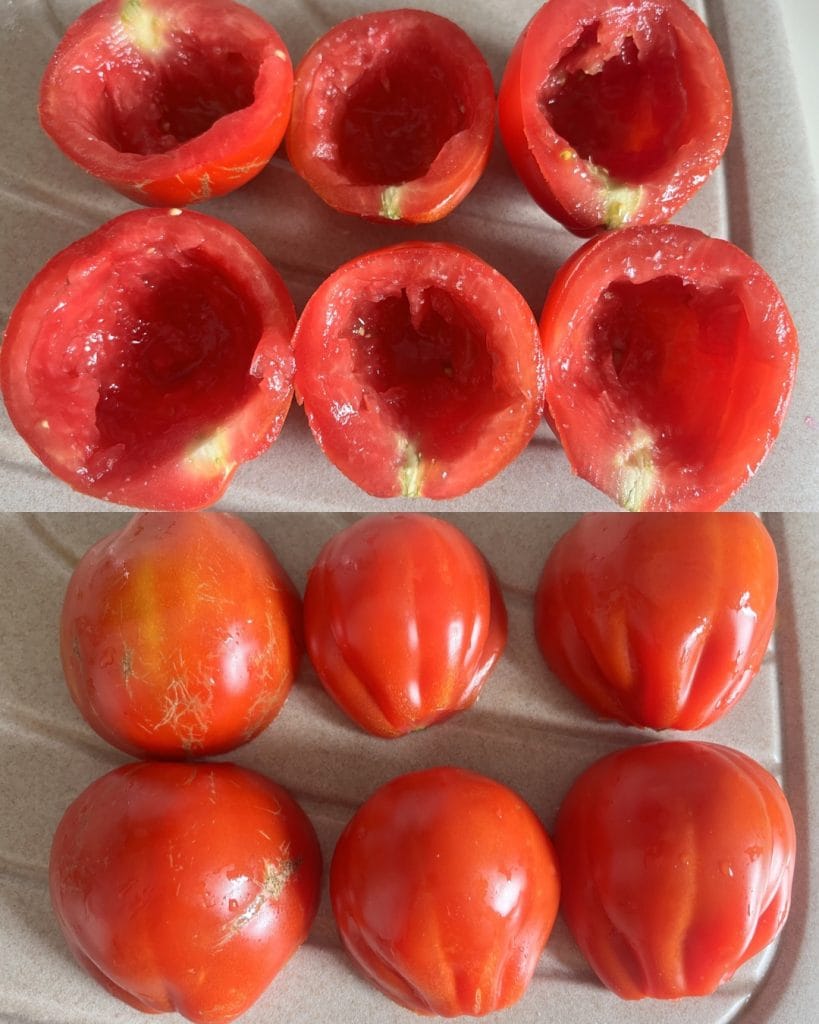 Para preparar los deliciosos tomates rellenos crudos, elige tomates maduros corazón de buey, frescos.