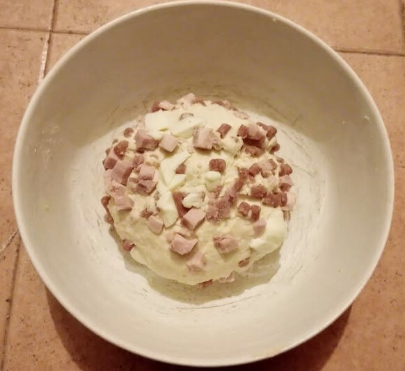Verter la mezcla sobre la mesa continuando a trabajarla con las manos, agregar el queso y el salami cortados en trozos, el jamón cocido en cubitos.