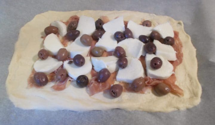 Espolvorear orégano al gusto, añadir las lonchas de jamón curado, la mozzarella cortada y las aceitunas.Enrollar el rectángulo sobre sí mismo desde el lado más largo.
