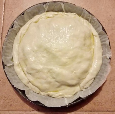 Forrar un molde con papel de horno o untarlo con aceite, extender una parte de la bola dejando los bordes altos, añadir las acelgas, cucharadas de harina y la prescinseua o la ricotta mezclada con el yogur.