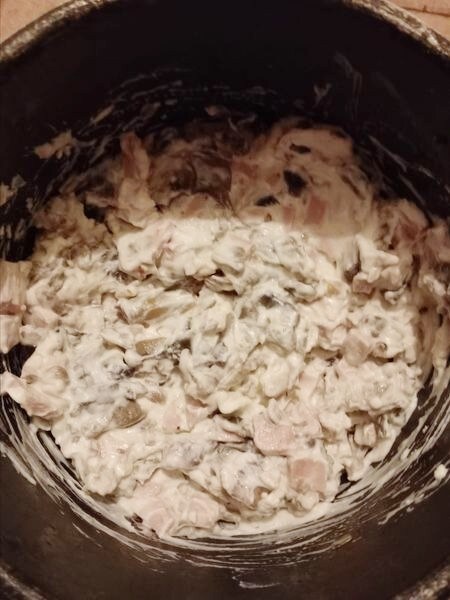 En un bol, verter la ricotta, la nuez moscada, la mortadela cortada en dados y los champiñones.