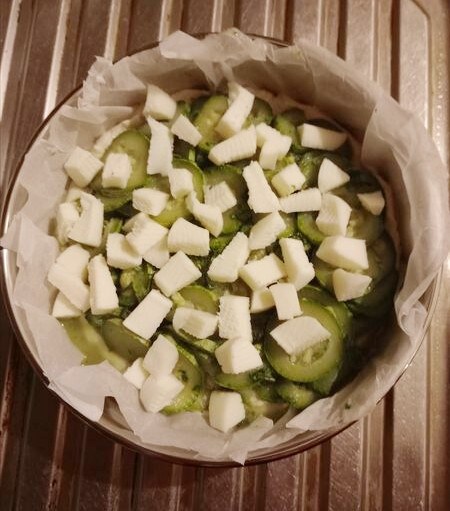 • Preparar el pesto siguiendo la receta aquí. Preparar la pasta matta siguiendo la receta aquí y dejarla reposar al menos 40 minutos. Lavar los calabacines, cortarlos en rodajas y cocinarlos en una sartén con un poco de agua. Una vez que estén tiernos, apagar el fuego, escurrirlos, verterlos en un bol y condimentarlos con el pesto. Tomar un molde de 22 cm de diámetro, forrarlo con papel de horno, extender la mitad de la pasta matta, verter el relleno de calabacines y el queso galbanino troceado.